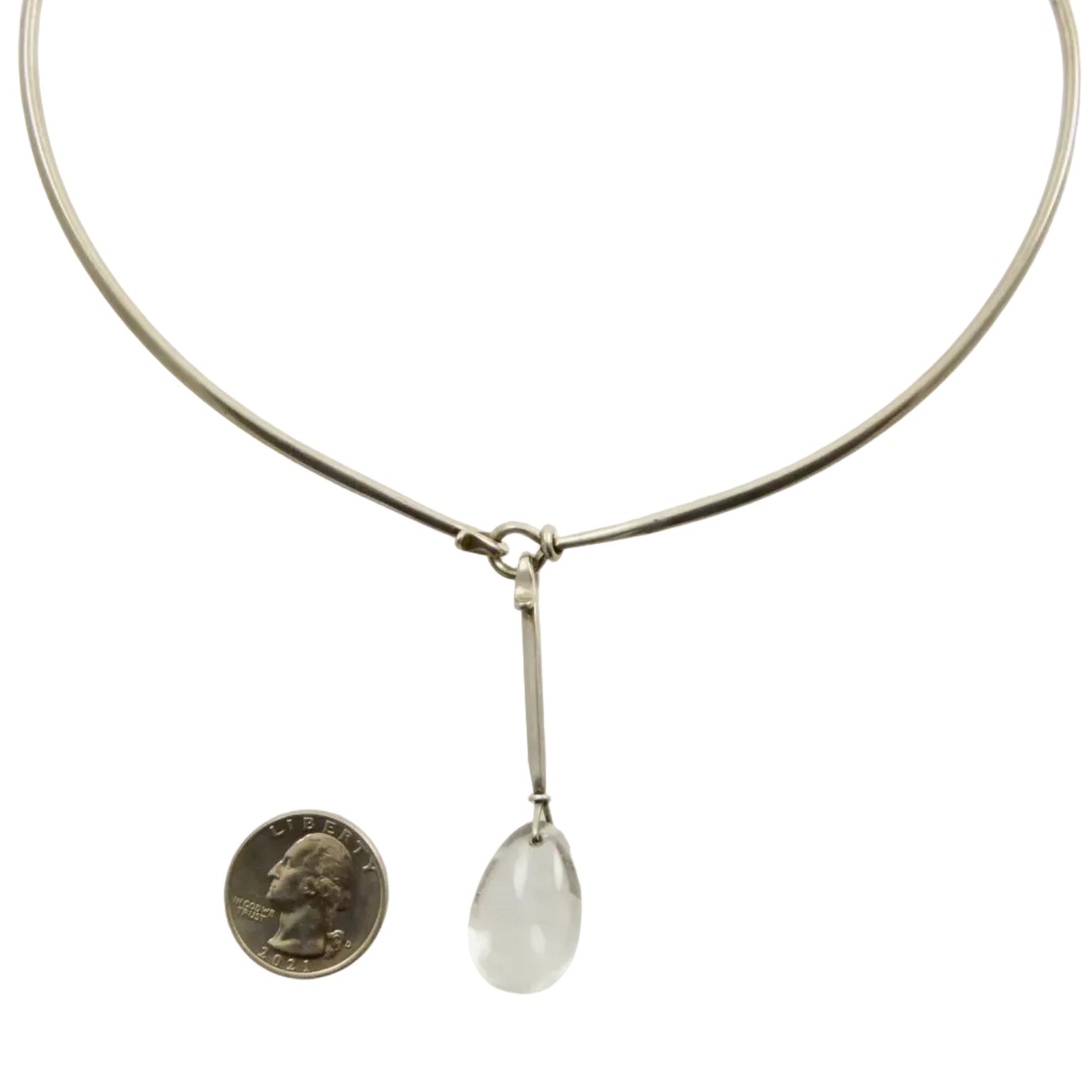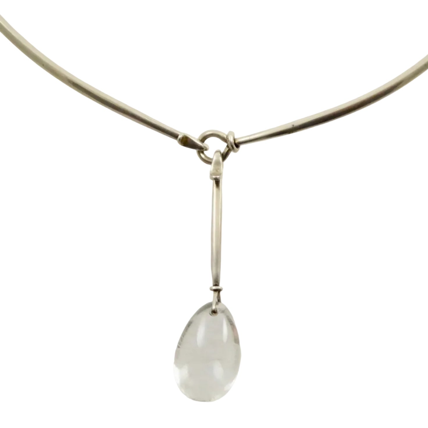 Vivianna Torun Bulow-Hube (1927-2004), often referred to simply as Torun, was one of the most innovative mid-century modernist designers. Her designs are streamlined and elegant, which can clearly be seen in this marvelous necklace that she designed for Georg Jensen. Here, a teardrop-shaped pendant of finely rutilated quartz is suspended from an oval neck ring. The neck ring is shaped to sit wide around your neck and close to the base of the throat; and once you own it, it can be adjusted to fit the contours of your neck and shoulders.