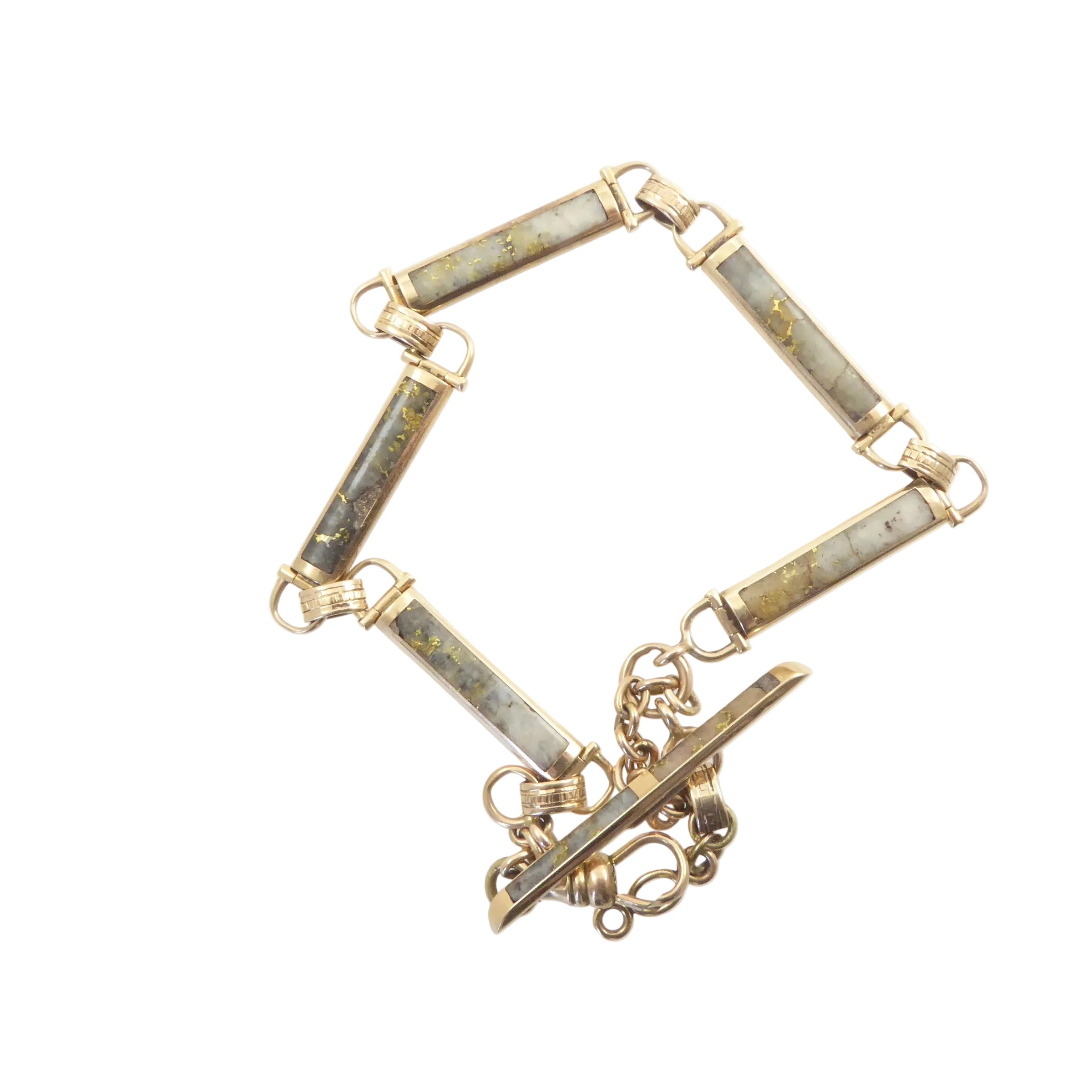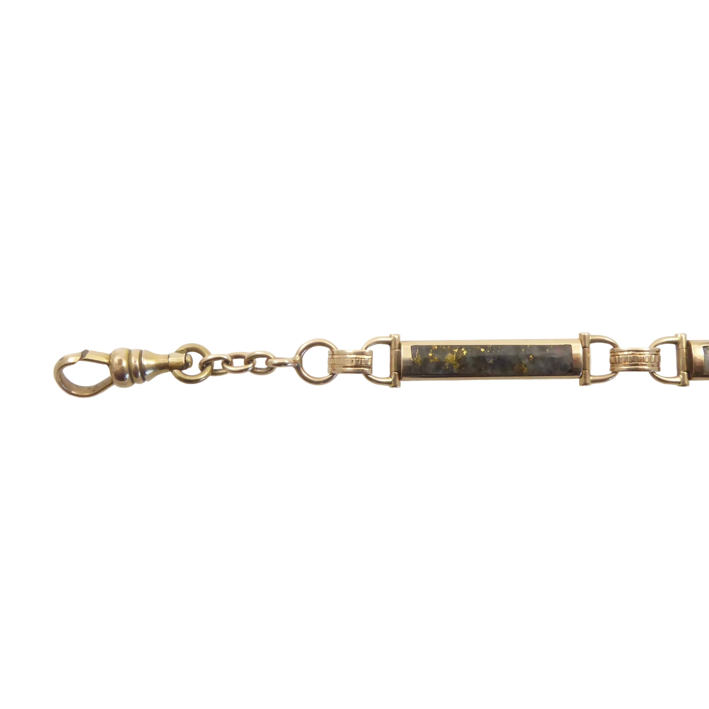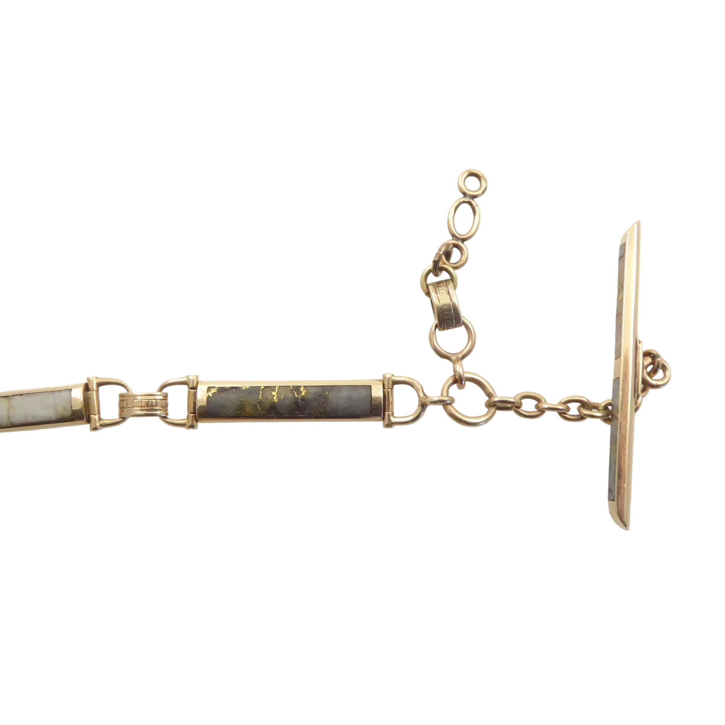 This antique gold-in-quartz watch chain has a modern edge to it due to its graphic use of with both white and black backgrounds shot through with glistening gold. The slabs of stone are set in 14 karat gold with a slightly rosy tinge. The gold-in-quartz stones are set into both sides of each link, although only one side of the t-bar. Each link is hinged on both ends.